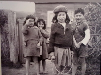 View of a young woman wearing a straw hat (Jo Howearth) and a young boy wearing a beret as seen on horseback in the Northland countryside.